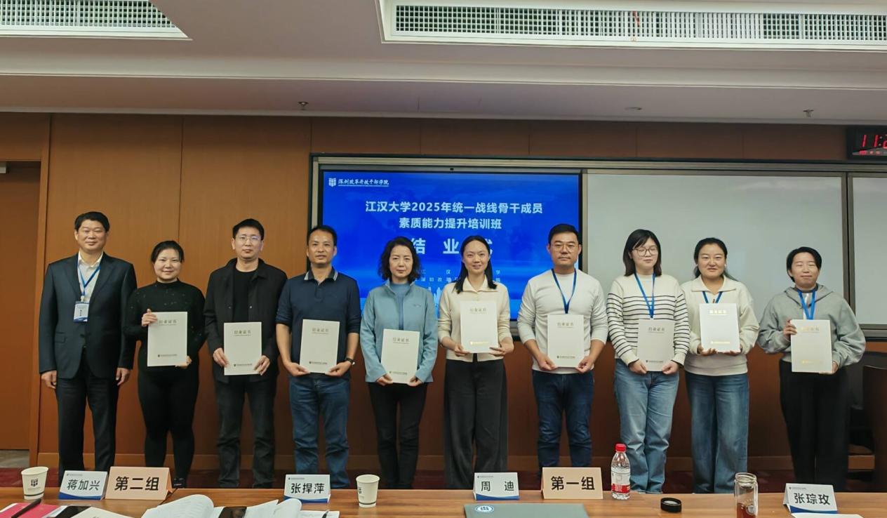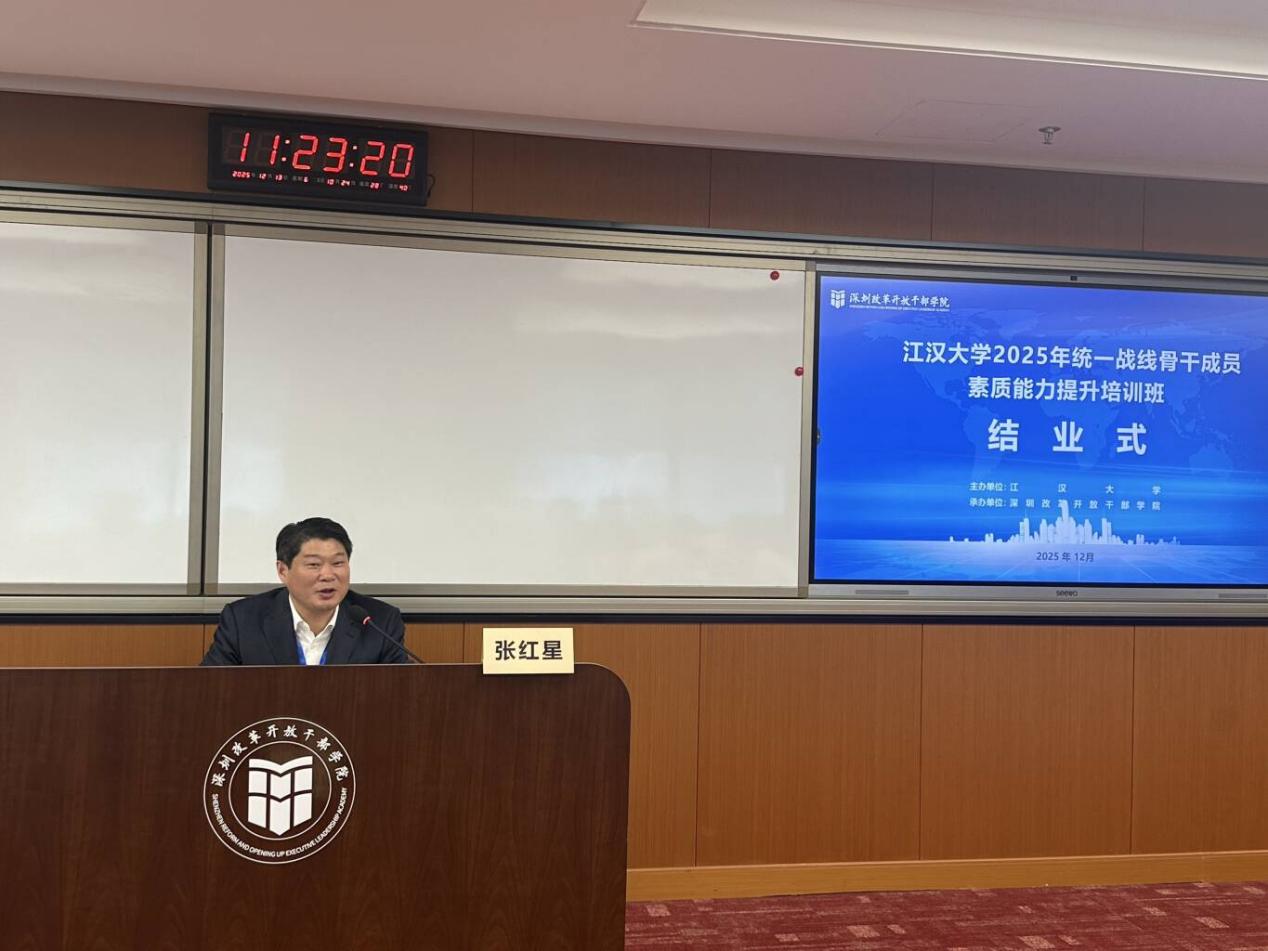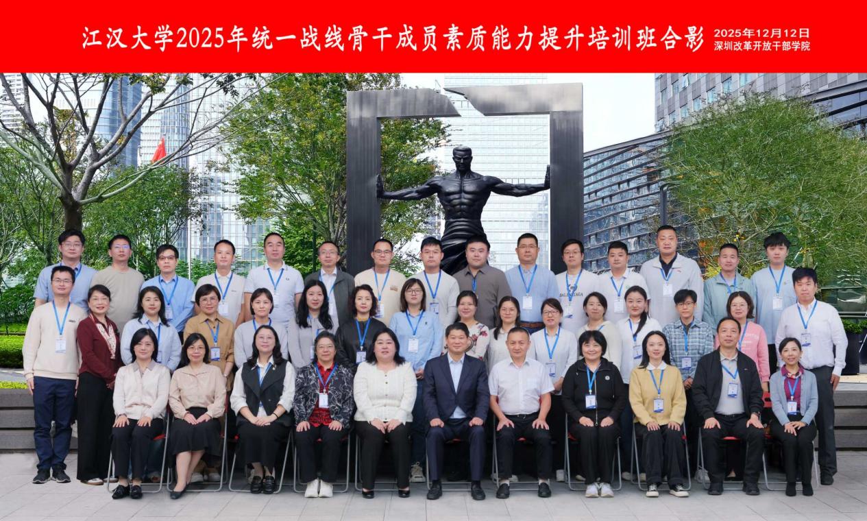 为深入学习贯彻党的二十届四中全会精神,深刻认识和把握“十五五”时期党和国家事业发展所处历史方位、面临的发展环境、指导方针和目标任务,持续巩固深化“凝心铸魂强根基、团结奋进新征程”主题教育成果,提升党外知识分子参政议政、业务工作及社会服务能力,充分发挥统一战线骨干成员在学校发展和服务地方经济中的优势作用,江汉大学党委统战部联合深圳改革开放干部学院,于12 月 8日--12 月 13 日在武汉和深圳组织开展为期 6天的 “江汉大学 2025 年统一战线骨干成员素质能力提升培训班”,学校民主党派负责人,校统战团体负责人,无党派人士代表,市政协委员,统战干部,少数民族干部共40人参加培训。