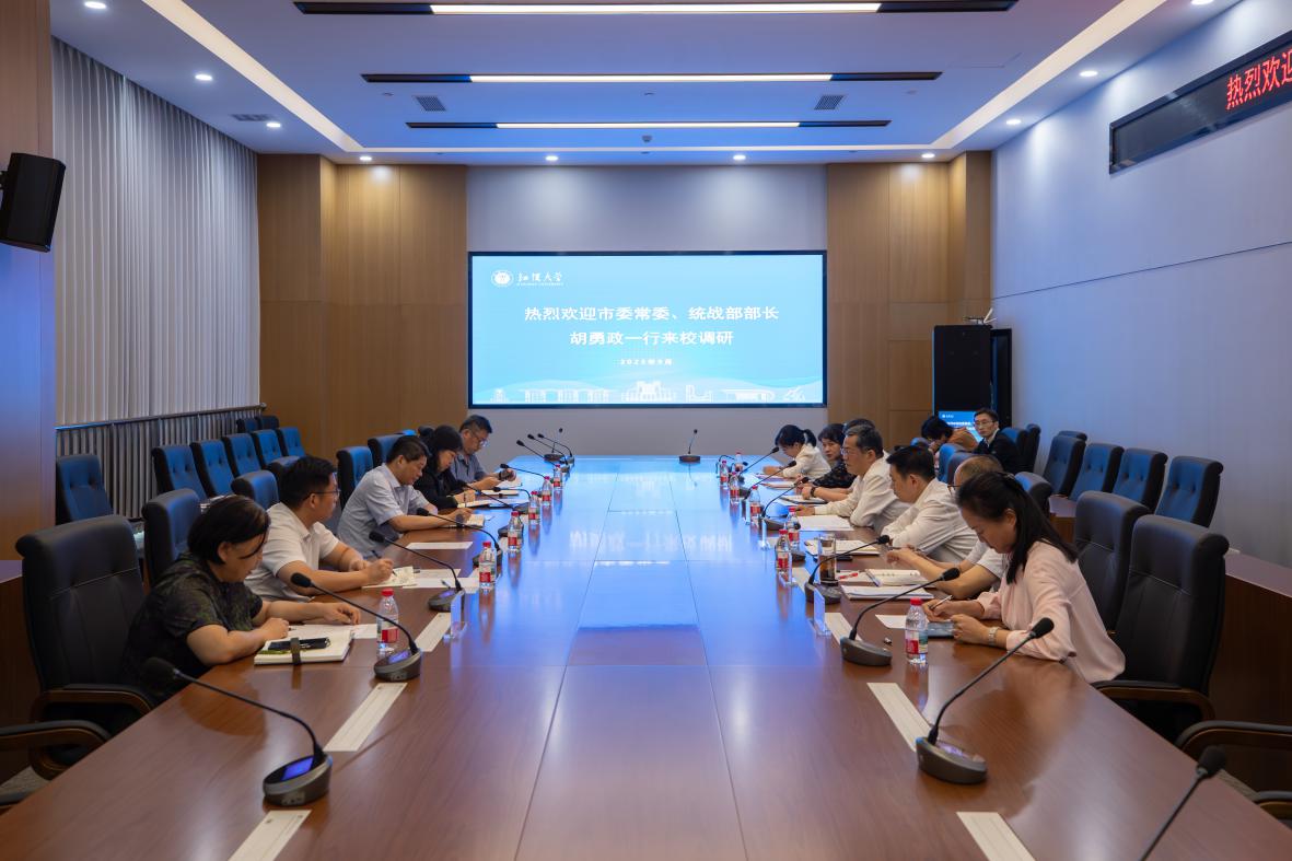 2025年9月18日下午,市委常委、统战部部长胡勇政,市委统战部副部长、市民宗委党组书记、主任朱绍华率市委统战部相关处室领导一行到江汉大学开展校地协作机制和武汉市第十二届运动会少数民族类项目暨武汉市第五届少数民族传统体育运动会筹备工作情况调研。经开区工委统战部相关负责人陪同调研。江汉大学党委书记覃道明,校党委副书记张红星热情接待,学校办公室、党委统战部、保卫处、体育学院等部门和单位负责人参与座谈。